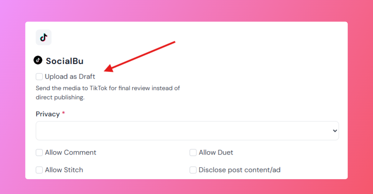You can now choose to send your TikTok content as a draft instead of publishing it right away. When you tick "Upload as Draft" while creating a TikTok post in SocialBu, the video gets uploaded to your TikTok account and saved in your Drafts — giving you a chance to review and tweak it inside the TikTok app before it goes live.