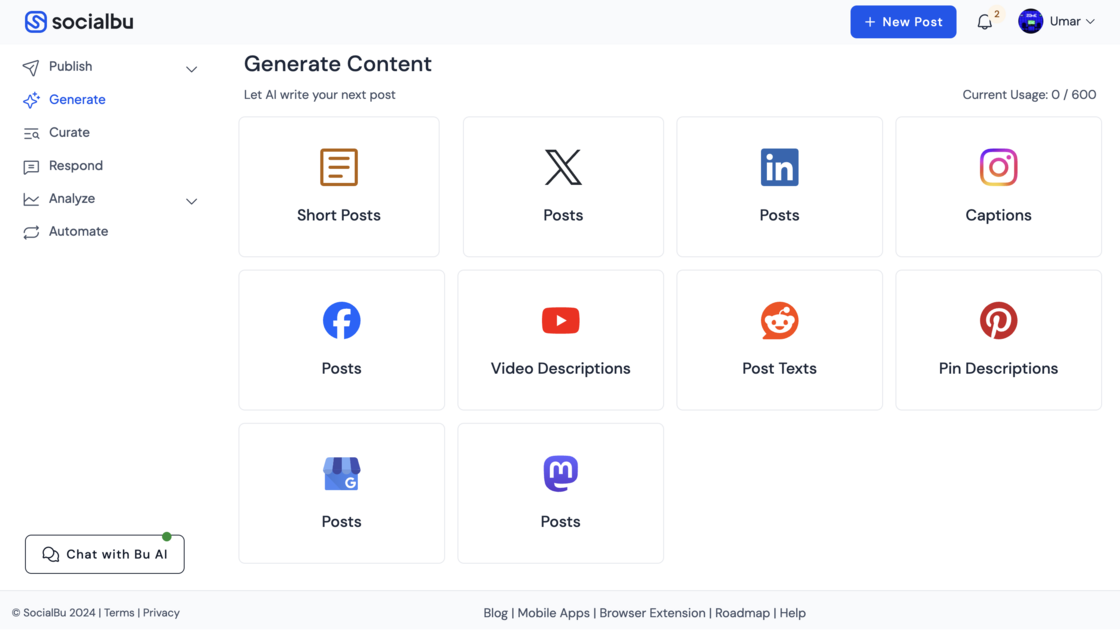 SocialBu’s Generate feature now lets you create posts for nine popular platforms—all in one place.Including Facebook, Instagram, LinkedIn, Twitter, and even niche platforms like Mastodon.