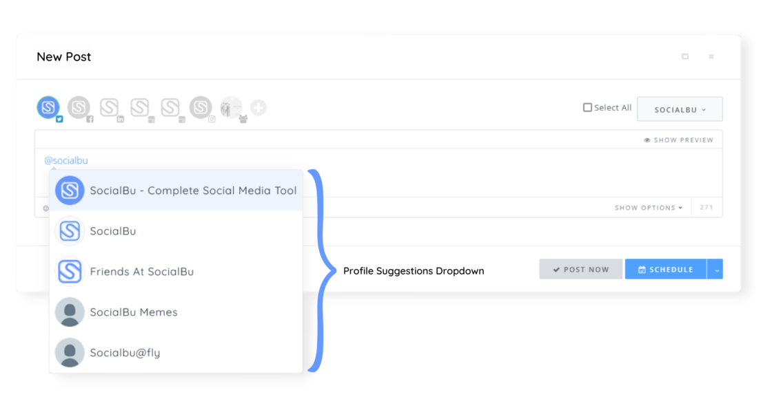You can now choose and tag from a suggestion drop down of Twitter profiles while tagging with SocialBu.