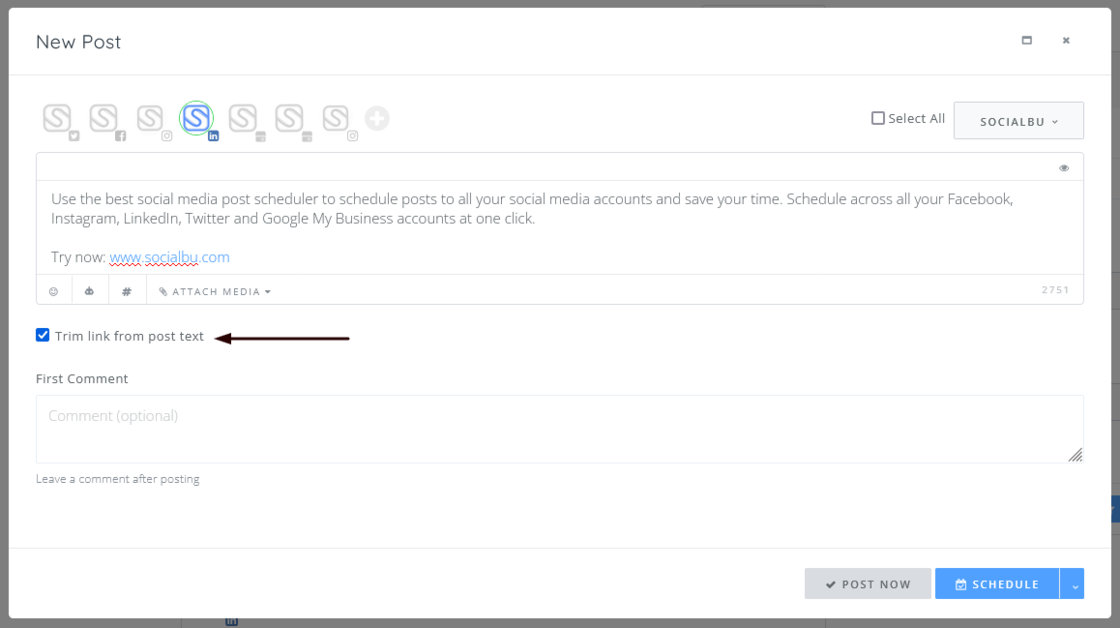 You can now schedule your posts on LinkedIn with a link in the text and SocialBu will allow you to trim the link from the text and convert it into a preview.